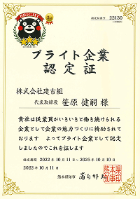 2022年ブライト企業認定証交付式において認定証を授与されました。この年は175社のブライト企業が認定され、今後「熊本県ブライト企業」認定企業として様々なPR活動が行われます。新聞での紹介、ガイドブック作成など熊本の雇用促進に協力をしていきます。