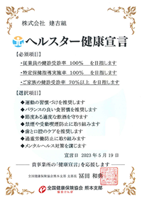 健康経営の実践に向け「ヘルスター健康宣言」にエントリーし、協会けんぽ熊本支部よりヘルスター健康宣言証を受領いたしました。従業員の健康づくりは会社で取り組むべき課題と捉え、健康経営の第一歩として実践してまいります。