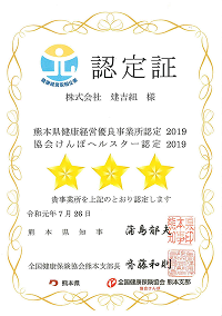 協会けんぽ熊本支部では、社員の健康づくりに積極的な事業所を評価する「ヘルスター認定制度」があります。当社はこの度、協会けんぽよりヘルスター認定証をいただきました。ランクは三段階のうち最高の三つ星と認定されました。