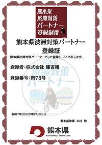 熊本県渋滞対策パートナー登録制度とは熊本県が、主に熊本都市圏における交通渋滞の解消に向けて以下の取り組みを実施する企業等に対し、「熊本県渋滞対策パートナー」として登録する制度です。当社も熊本の社会課題である熊本都市圏の交通渋滞の解消に向け、「熊本県渋滞対策パートナー登録制度」に登録しております。
