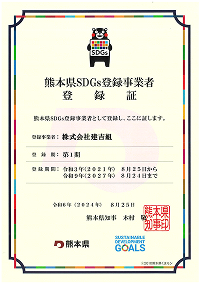 熊本県SDGs登録制度は、持続可能な開発目標(SDGs)に積極的に取り組む企業や団体を支援し、県内におけるSDGsの普及と推進を目的として熊本県が創設した制度です。当社は第1期より本制度に登録しており、現在は第2期登録事業者として継続的に参加しています。今後も登録企業として、持続可能な社会の実現に向けて、より一層の取り組みを進めてまいります。