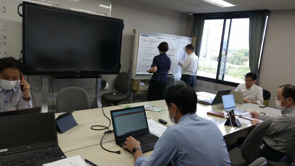 訓練では対策本部の設置・現場状況の確認や本社では社員の安否確認・情報収集の手順を再確認しました。